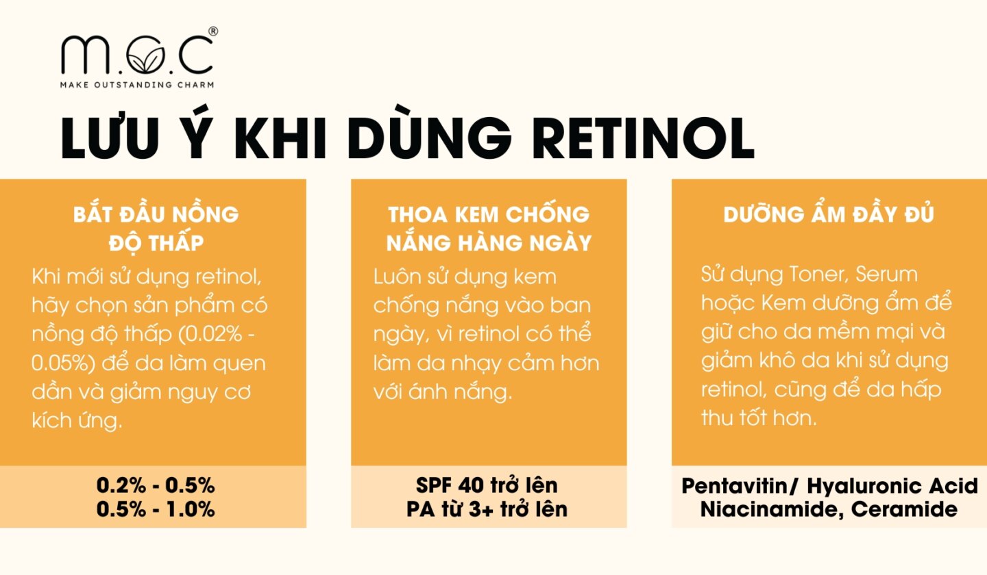 Lưu ý quan trọng chính là bắt đầu từ nồng độ thấp và tăng dần để tránh kích ứng. Bạn nên tránh sử dụng Retinol vào buổi sáng và nhớ thoa kem chống nắng vào ban ngày. Việc sử dụng kết hợp Retinol với các sản phẩm chứa AHA hay BHA cũng cần được thực hiện cẩn thận để tránh làm tăng độ nhạy cảm của da.