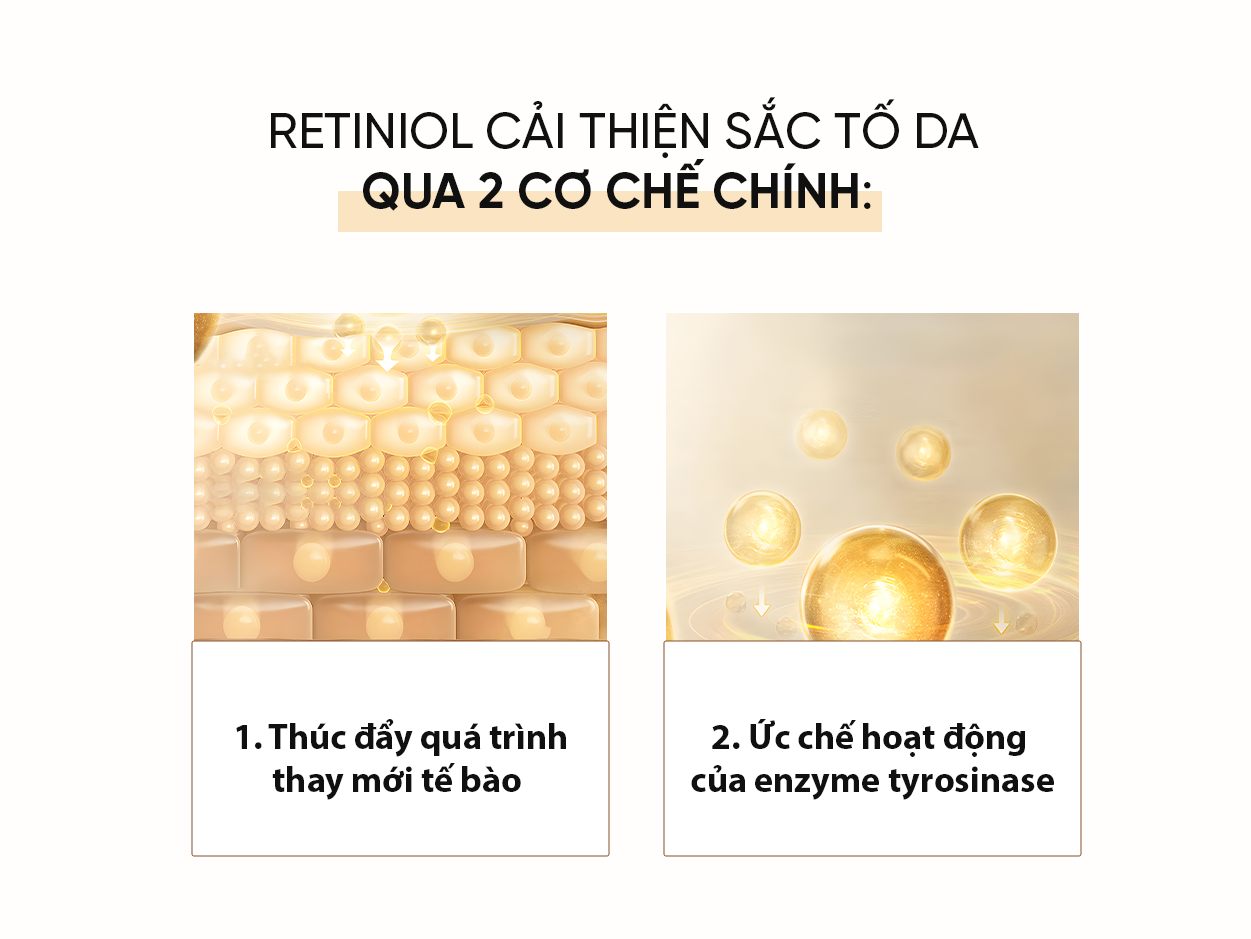 Retinol, một loại retinoid, thuộc nhóm vitamin A, có khả năng thúc đẩy quá trình tái tạo tế bào da và cải thiện tình trạng da nhờ cơ chế hoạt động độc đáo. Khi thoa lên da, Retinol sẽ chuyển đổi thành Retinoic Acid – một dạng hoạt động mạnh mẽ, tương tác với thụ thể trên bề mặt tế bào da. Điều này kích thích sản xuất collagen, giúp da vững chắc hơn, đồng thời làm mờ các khuyết điểm như nếp nhăn, vết thâm, hay tình trạng lão hóa.