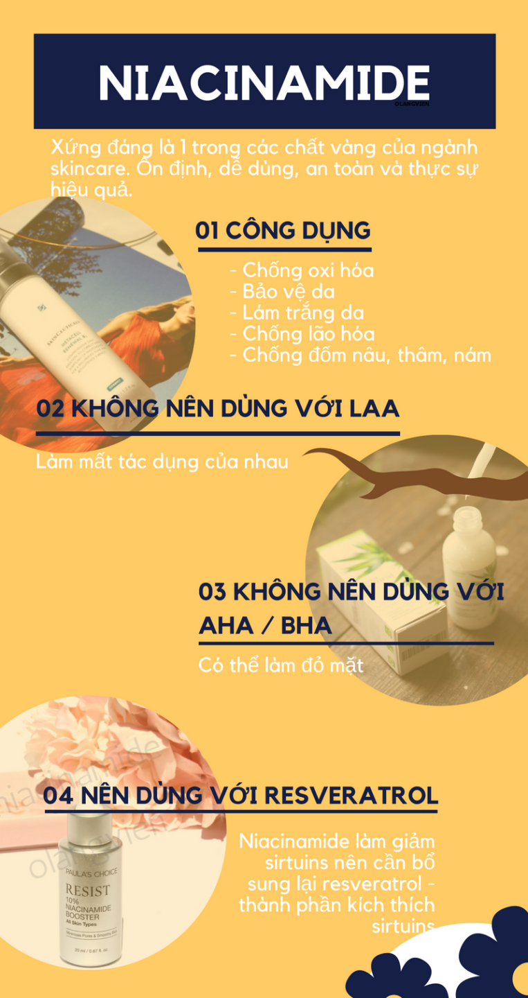 Ngoài ra, việc kết hợp Niacinamide với các thành phần như Hyaluronic Acid giúp tăng cường độ ẩm, Vitamin C hỗ trợ làm sáng, và Retinoids để cải thiện lão hóa là rất hiệu quả. Tuy nhiên, tránh kết hợp Niacinamide với các sản phẩm chứa vitamin C có nồng độ cao cùng lúc để tránh gây kích ứng.
